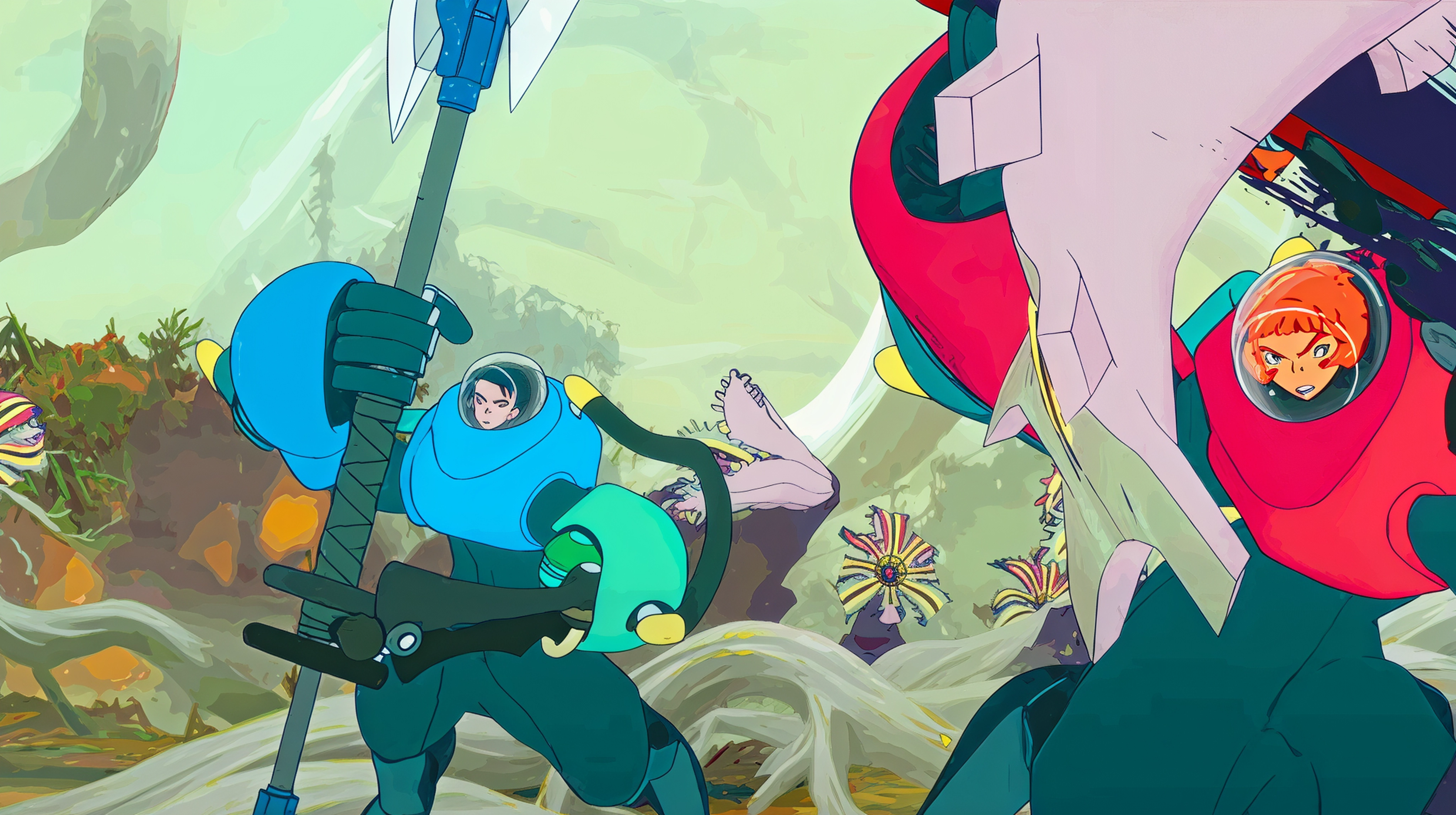 The voice cast includes Ai Mikami as Rita, Natsuki Hanae as Keiji, Kana Hanazawa as Shasta, and Hiccorohee as Raychell. The film’s screenplay is written by Yuichiro Kido, with art direction by Tomotaka Kubo and music by Yasuhiro Maeda. The theme song “Tsuretette” by AKASAKI adds a dynamic energy to the film’s soundtrack, while mechanical design by IZMOJUKI ensures the mecha elements stay visually striking.